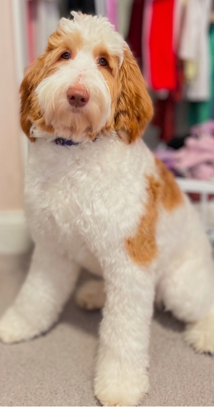Archie & Hunny’s puppies repeat breeding! Puppies are deep red to apricot with tuxedo or abstract markings, and red and white parti. Coats will be curly, wavy to straight. Puppies are raised on a curriculum (BAB) providing them with early exposure to various objects, settings, and people, creating a well balanced puppy.